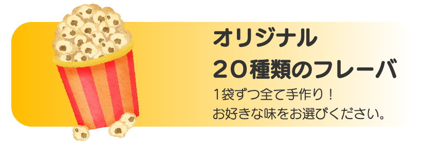 キャラメル/キャラメルチーズ/チョコ/いちごミルク/ココナツ/抹茶/メープル/ホワイトチョコ/チョコキャラメル/抹茶チョコ/黒蜜きなこ/はちみつバター/チェダーチーズ/ブラックペパー/旨塩/梅かつを/コンソメ/北海道バターしょうゆ/ペッパーアンドチーズ/瀬戸内の塩とレモン
