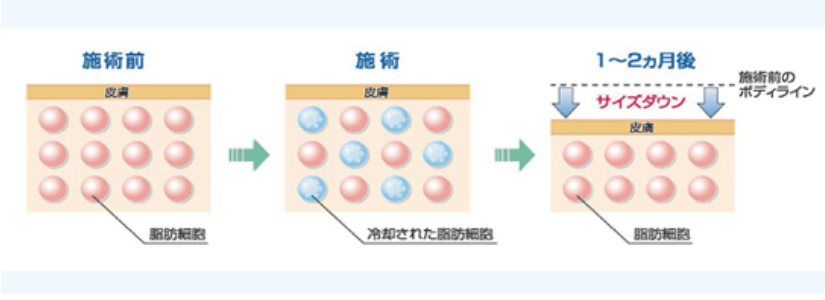 吸引冷却された脂肪細胞がアポトーシス(自然死)し、正常な新陳代謝プロセスにより体外へ排出されます。このプロセスが繰り返されることにより、脂肪が減少していきます。